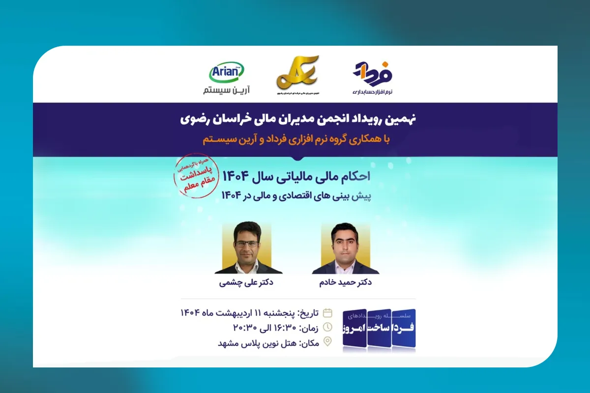 نهمین رویداد انجمن مدیران مالی حرفه ای خراسان رضوی با همکاری گروه آرین سیستم (فرداد) با موضوع احکام مالیاتی و پیش بینی های مالی -اقتصادی ۱۴۰۴، به همراه پاسداشت مقام روز معلم در ۱۱ اردیبهشت برگزار خواهد شد.